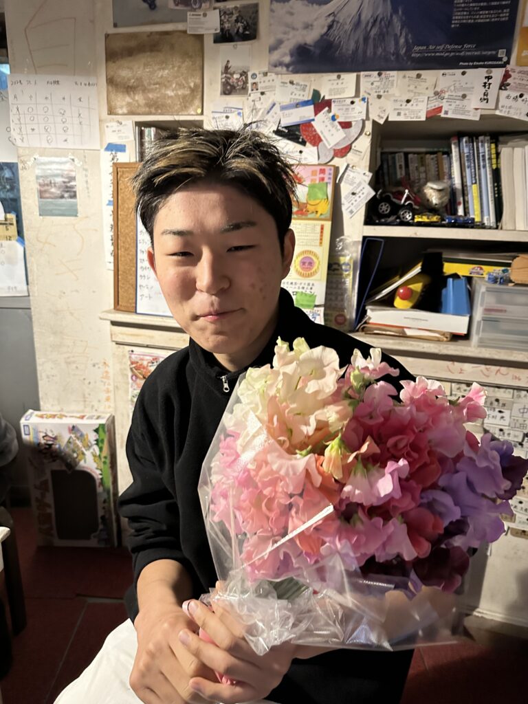 新年にはOBOGの先輩方が社会に出て身につけた貴重な贈り物をもって帰ってきました。本気の本音なのでためになることばかりです。今年はどんな年になるのか したいのか とっても楽しみです。飛翔もステップアップしていきます。ついしん二十歳のお祝いにお酒を注いでいます「鍋島」。恵方巻きを頬張ってるよ~集合写真撮りそこないました。